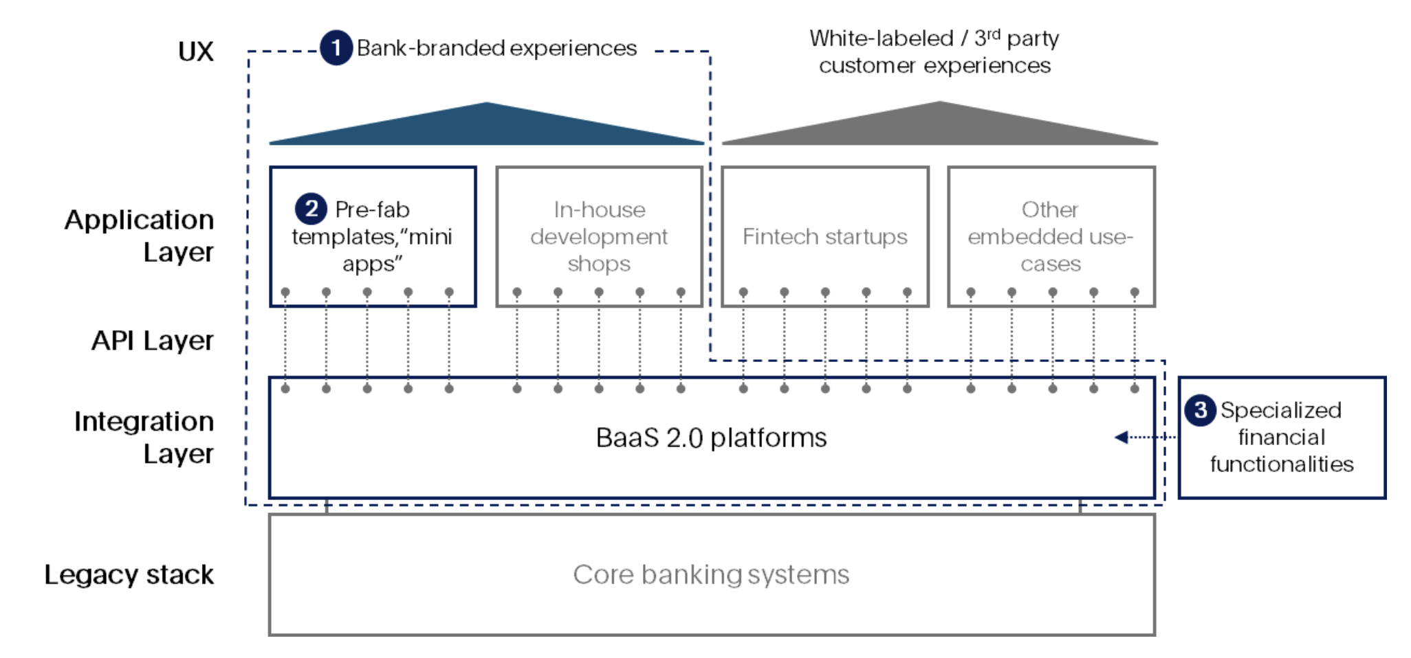 While the new generation of BaaS players will have their hands full with difficult integrations and much longer bank sales cycles, they will likely need to rely on third parties to develop specific subcomponents or functionalities. In the future state, we envision that BaaS 2.0 will not only act as the orchestration layer and interface on top of the core banking systems, but it may also become a distribution channel for a curated and specialized set of point solutions by third parties that it can supply seamlessly to banks.